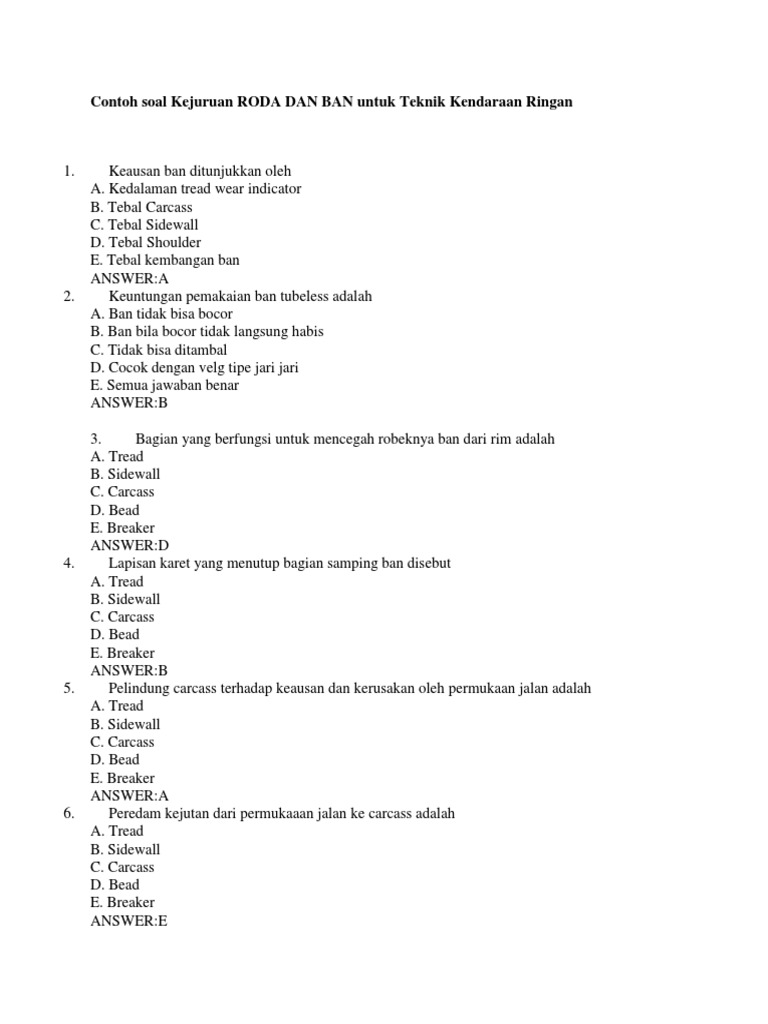 Soal latihan ban dan roda semester genap kelas x tkr 1 otomotif 2013 a.